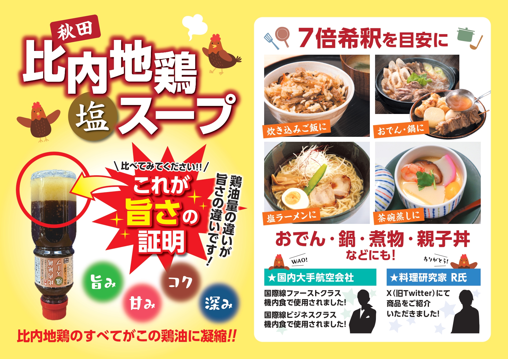 本品「比内地鶏 塩スープ」は、比内地鶏のエキス量が多いため【7倍希釈】でご使用ください。 |